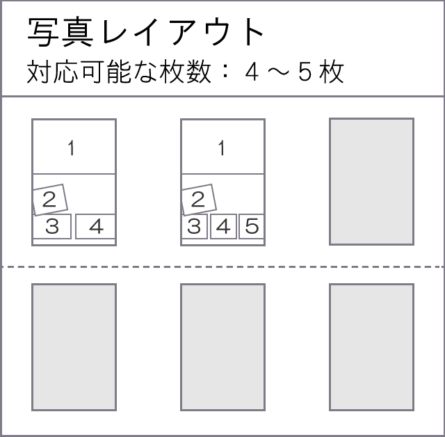 お預かりしたお写真にあわせてスナップの形状や写真の傾き、レイアウトなど一部変更をさせていただく場合がございます。
