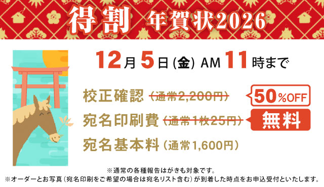 特割実施中! 12月5日(金)AM11:00まで 合計価格には基本料金(レイアウト技術料、テンプレート調整、色調補正)と印刷加工費が含まれます