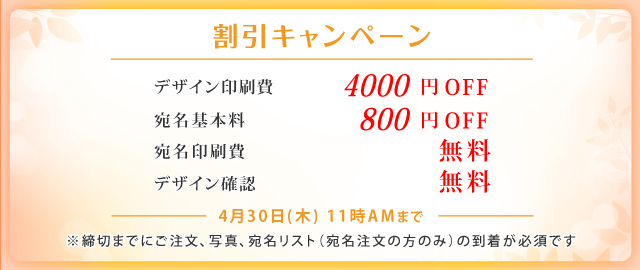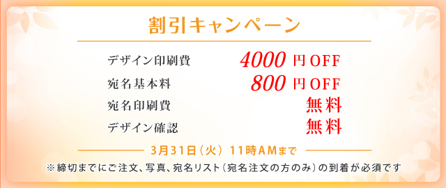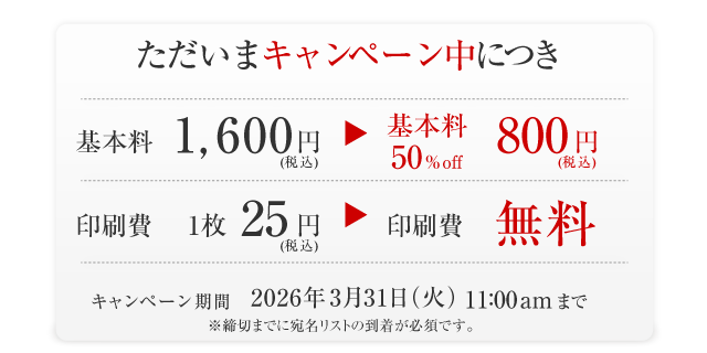 | 宛名印刷オプション | キャンペーンにつき 基本料金50%OFF! 印刷料金無料! |