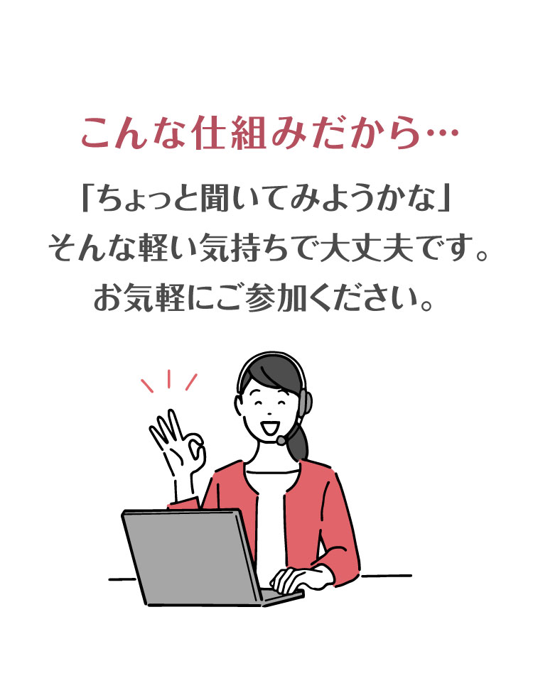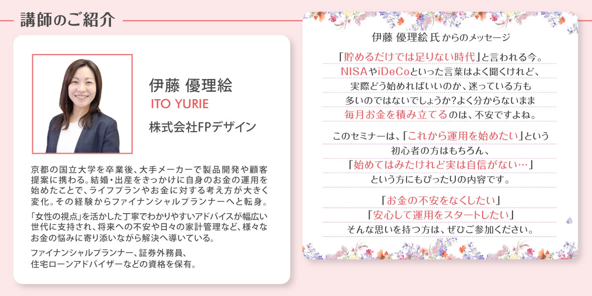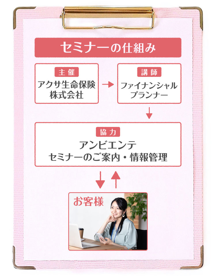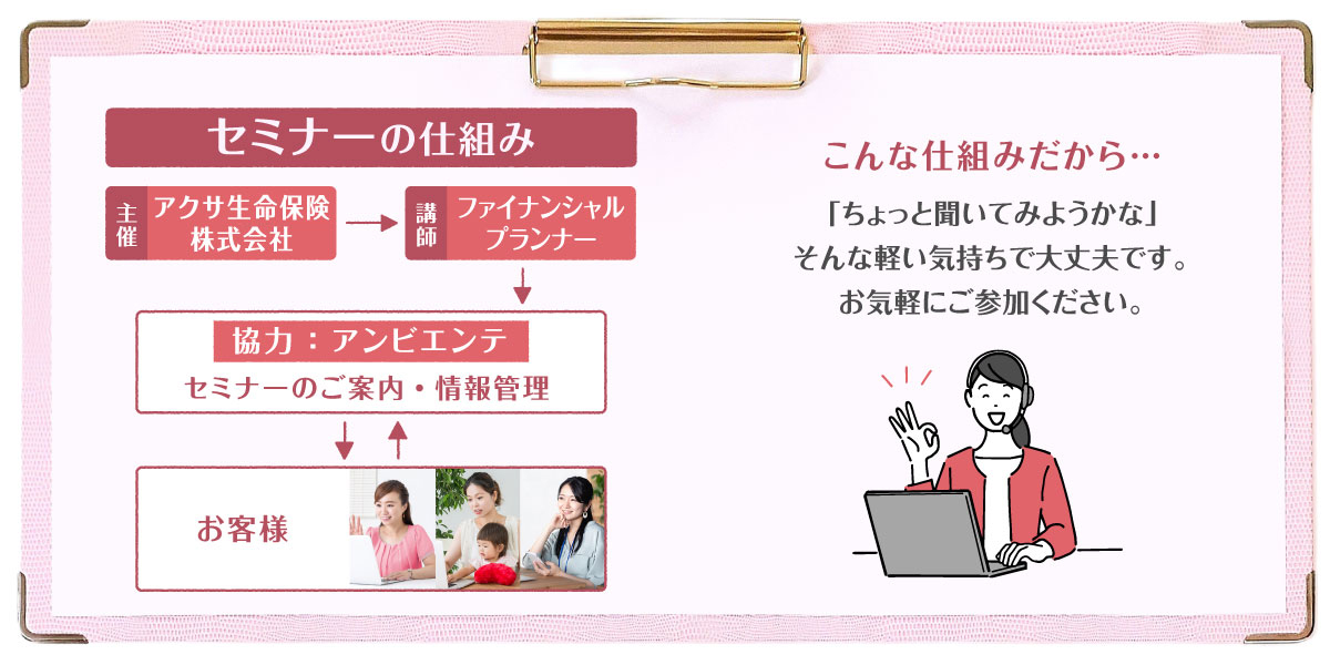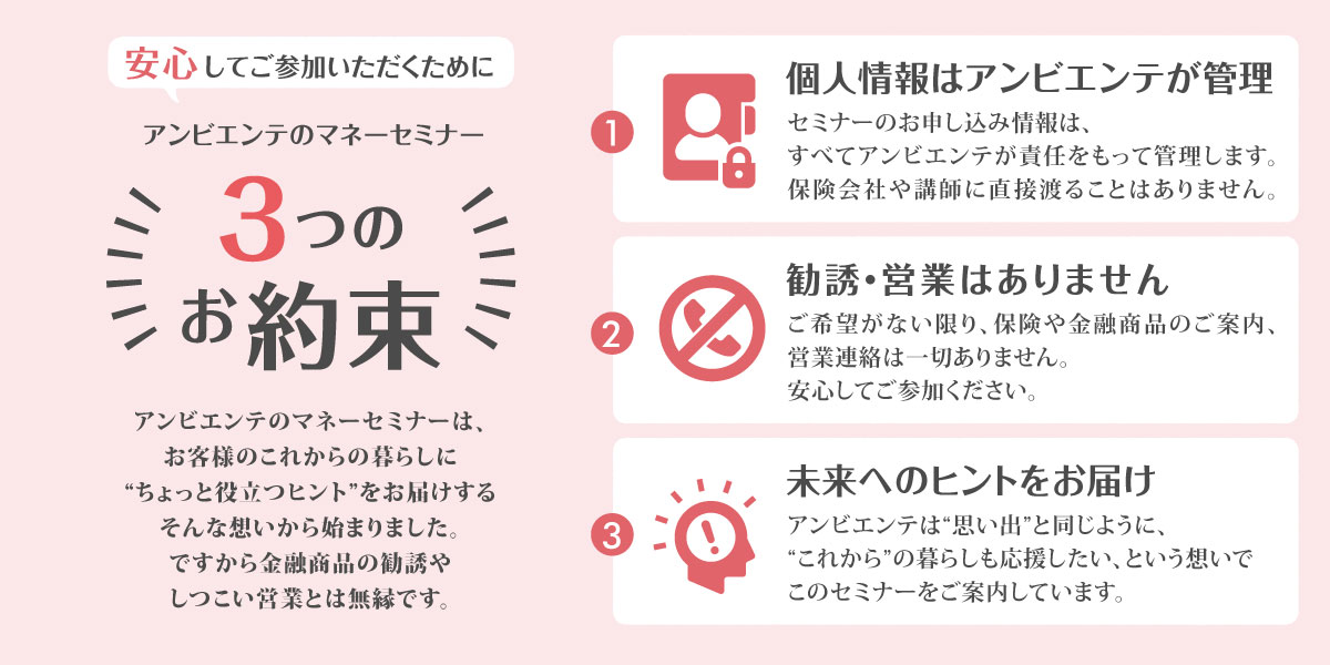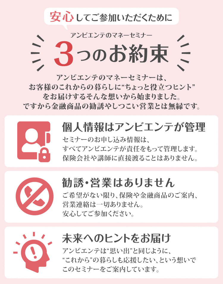 ・セミナー内では特定の商品を紹介・勧誘することはありません。