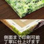 キャンバスは木枠裏側でタッカー止めし、表側からは金具は見えない仕様です(包張り仕上げ)。そのため、木枠側面にあたる部分にも印刷可能なタイプです。