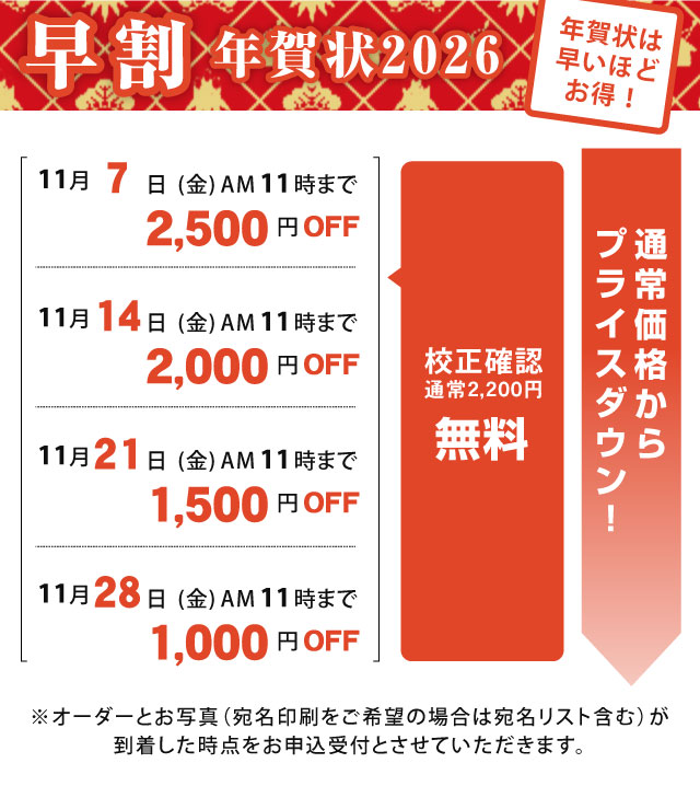 | 宛名印刷オプション | キャンペーンにつき 基本料金50%OFF、印刷料金は 無料! |