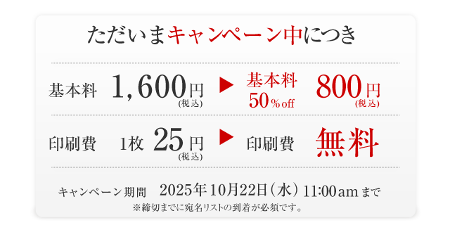 各種キャンペーンは締め切りまでに宛名リストが到着している場合に適用となります。 ご注意ください! ※宛名リストについてのお問合せ、キャンセル等につきましてはメール、お問合せフォーム、またはお電話にてご連絡ください。